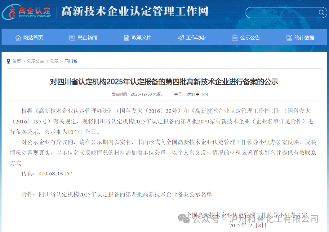 近日,全国高新技术企业认定管理工作领导小组办公室发布《对四川省认定机构2025年认定报备的第四批高新技术企业进行备案的公示》,泸州和普化工有限公司顺利通过“高新技术企业”认定。
